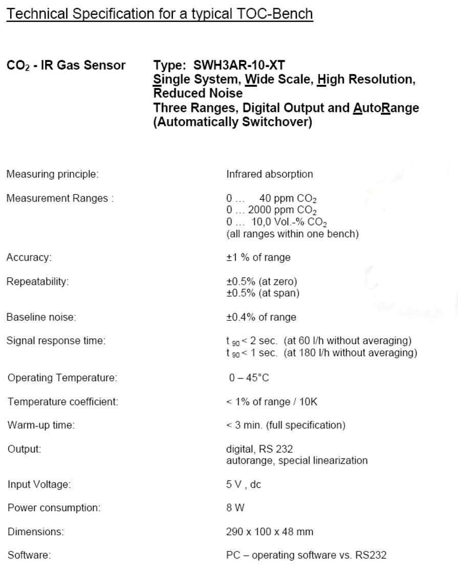 TOC-IR 是應用于水中總碳的分析,測量CO2 濃度可最低到 40ppm,最高可到100%,精度達到1%,并同時可實現多量程功能,自動切換以滿足不同測量精度。其基于NDIR 技術,該模塊設計主要用于總碳分析系統。